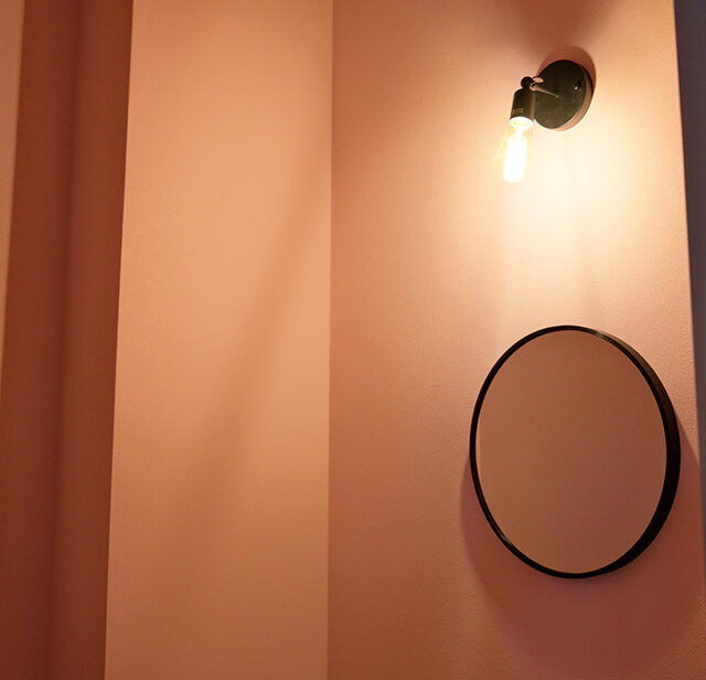 ◾️壁はグレーで、スツールもブラック、照明も落ち着いた雰囲気に統一