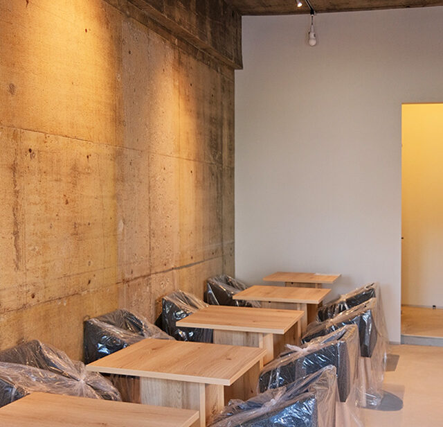 コンクリートのあらわしの壁はそのままに、色のバランスや素材感で優しい空間に。シンプルでソリッドなデザインのテーブルも木の質感が柔らかな印象に感じられるように設計しています。
