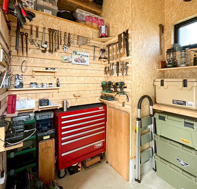 ご主人のためのガレージは、OSB合板貼りの仕上げ。