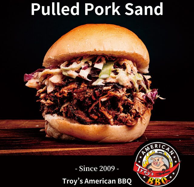米国南部ソウルフードのプルドポークサンド。薪と炭で9時間BBQしっとりホロホロ肉のTroy手づくりの味をどうぞ。